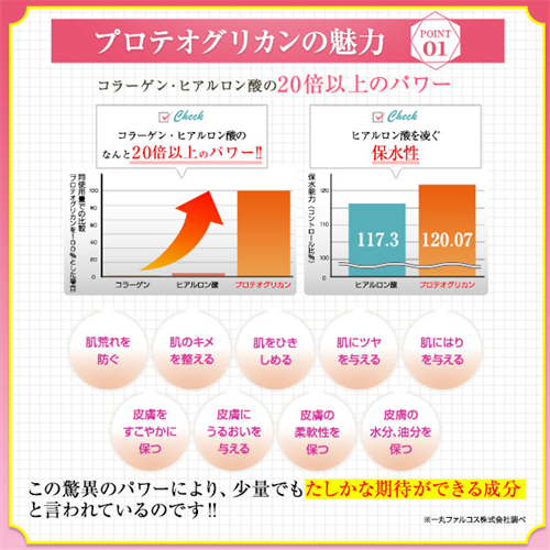 ヒアルロン酸Na、水、加水分解コラーゲン、プラセンタエキス、パルミチン酸レチノール、水溶性プロテオグリカン、ユビキノン、アデノシン、エクトイン、ローヤルゼリーエキス、加水分解卵殻膜、ナイアシンアミド、プルラン、グリセリン、キャビアエキス、トコフェロール、グリコシルトレハロース、加水分解水添デンプン、パルミチン酸アスコルビルリン酸3Na、テトラヘキシルデカン酸アスコルビル、ヒアルロン酸クロスポリマーNa、アンズ核油、アボカド油、カニナバラ果実油、ペンチレングリコール、クダモノトケイソウ果実エキス、カラスムギ穀粒エキス、ジ酢酸ジペプチドジアミノブチロイルベンジルアミド、フラーレン、アセチルヘキサペプチド-8、クオタニウム-33、コレステロール、セラミドNG、セラミドNP、セラミドAP、PG、イソプロパノール、ヒマワリ種子油、ナットウガム、BG、コーン油、PVP、塩化Na、ジステアリルジモニウムクロリド、フェノキシエタノール、ソルビン酸K、ヒドロキシアセトフェノン、リン酸Na、リン酸2Na