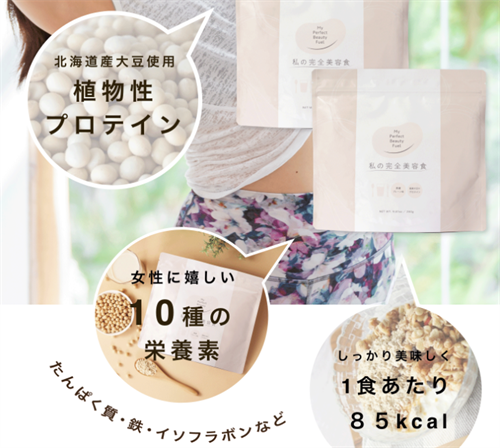 美容と健康を一度にケアできる女性のためのプロテイン【私の完全美容食】。 口コミで高評価を受けている理由は、合成甘味料や香料をカットし、国産素材を使っている点です。 女性の健康と美容をサポートするプロテイン、私の完全美容食は、国産大豆を使用した安全性の高い商品です。 10種の栄養素がバランスよく含まれており、ダイエット中や忙しい生活でも手軽に栄養補給ができます。 以下