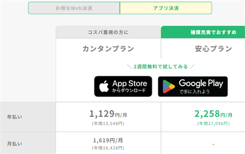 | アプリ決済 | 安心プラン | 年払い | 2,258円 | 27,096円 |
