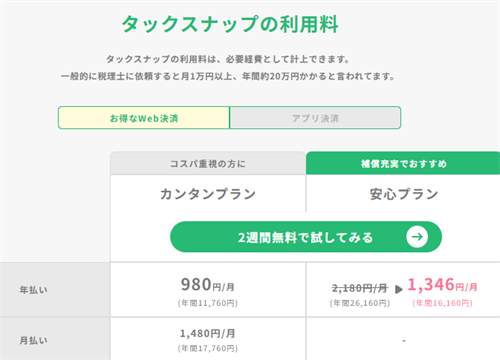 タックスナップは有料アプリであり、月額または年額で料金が発生します。
